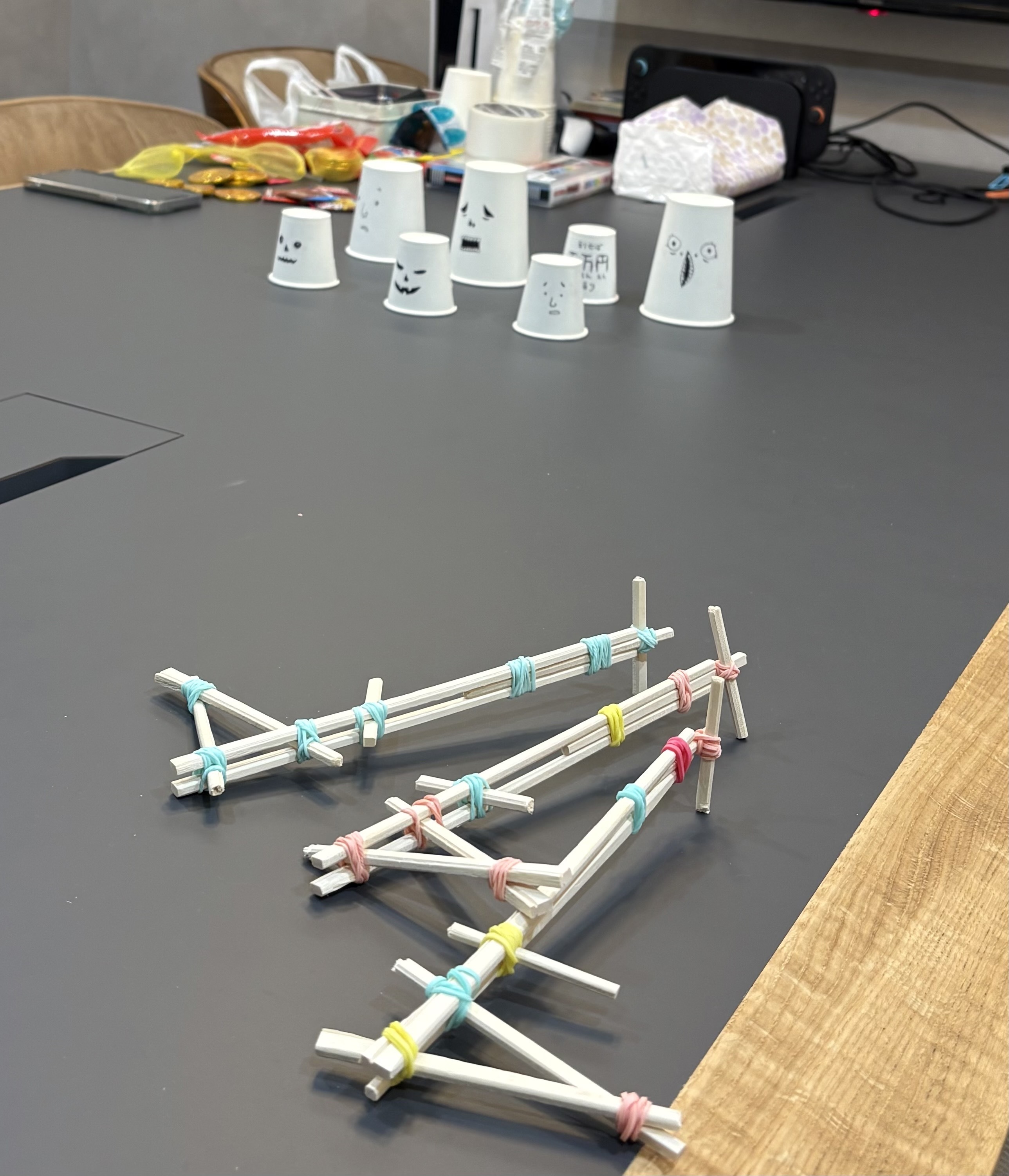 →割りばしの銃で輪ゴムを飛ばして紙コップを倒すゲームです。